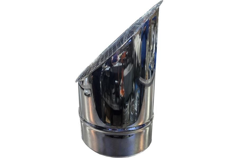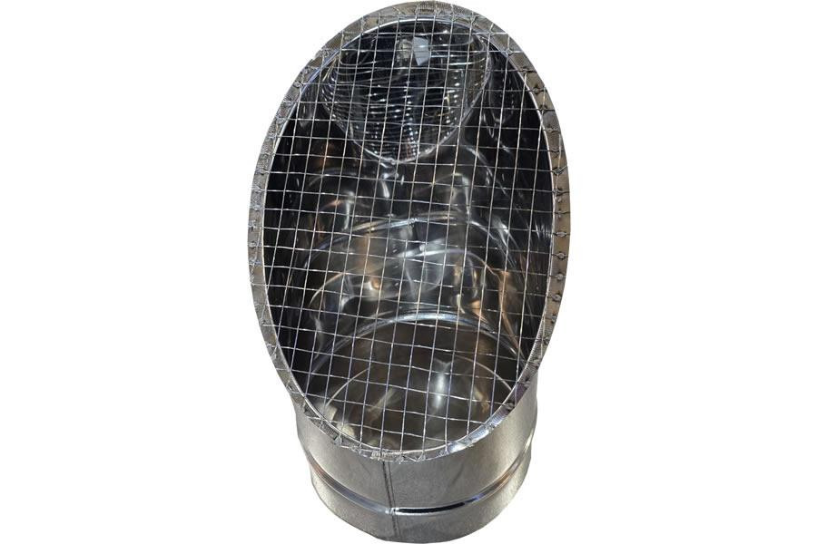 Косой или скошенный участок воздуховода круглого сечения с сварной сеткой предназначен для выхода систем приточной/вытяжной вентиляции. Отверстие оснащено защитной сеткой и изготовлено из оцинкованной стали. Выходная часть имеет наклон для защиты системы от дождя, снега и других атмосферных осадков.